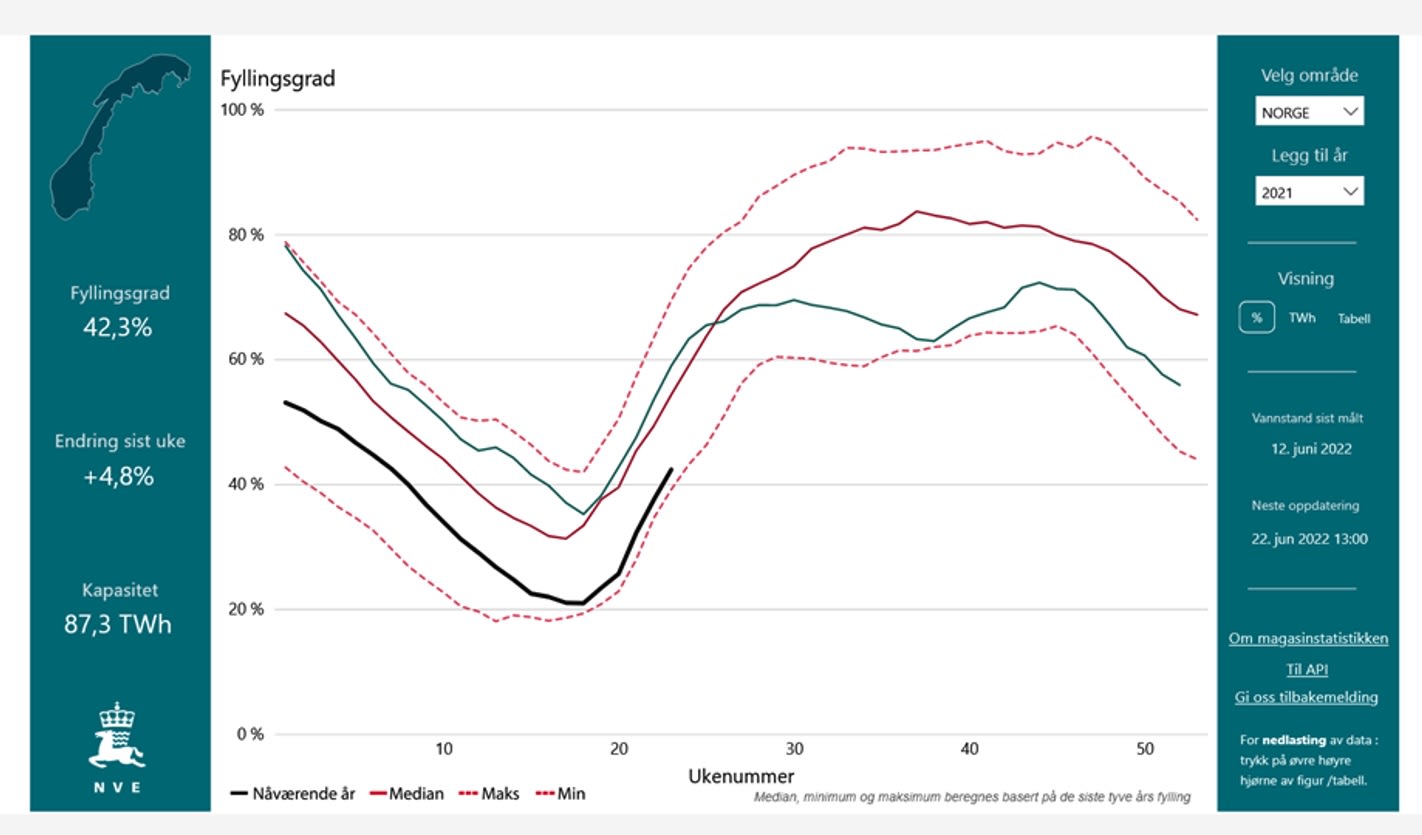 Oversikten over magasinfyllingen som NVE presenterer hver onsdag viser svært dårlig oppfylling. Oversikten for 12. juni: