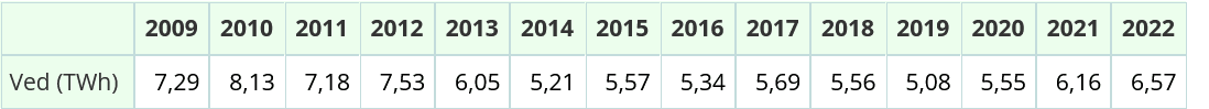 Brutto energiinnhold i vedforbruket i boliger og fritidsboliger 2009-2022. Kilde SSB.